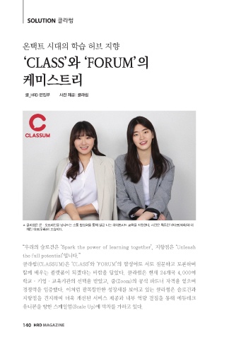 ▲ 클라썸은 온·오프라인을 넘나드는 소통 활성화를 통해 실감 나는 하이브리드 교육을 지원한다. 사진은 최유진 부대표(좌측)와 이