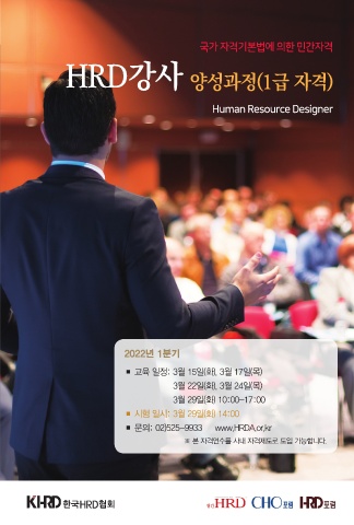VOL.378 2022.2 국가 자격기본법에 의한 민간자격 HRD강사 양성과정(1급 자격) Human Resource Designer 2022년 1분기 ■ 교육 일정: 3월 15일(화), 3월 17일(목) 3월 22일(화), 3월 24일(목) 3월 29일(화) 10:00-17:00 ■ 시험 일시: 3월 29일(화) 14:00 ■ 문의: 02)525-9933 www.HRDA.or.kr ※ 본 자격연수를 사내 자격제도로 도입 가능합니다.