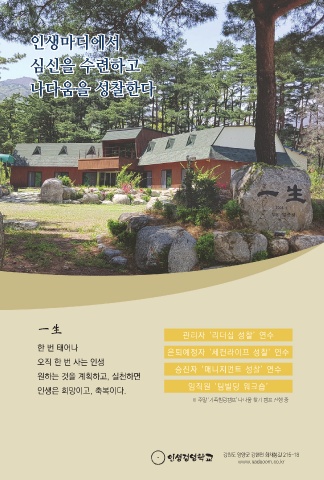 인생마디에서 인생마디에서 심신을 수련하고 심신을 수련하고 나다움을 성찰한다 나다움을 성찰한다 一生 관리자 ‘리더십 성찰’ 연수 한 번 태어나 은퇴예정자 ‘세컨라이프 성찰’ 연수 오직 한 번 사는 인생 승진자 ‘매니지먼트 성찰’ 연수 원하는 것을 계획하고, 실천하면 임직원 ‘팀빌딩 워크숍’ 인생은 희망이고, 축복이다. ※ 주말 ‘가족힐링캠프’ 나다움 찾기 캠프 진행 중 강원도 양양군 강현면 화채봉길 215-18 www.nadaoom.co.kr