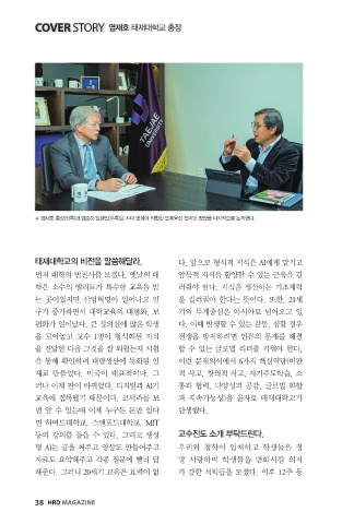 ▲ 염재호 총장(좌측)과 엄준하 발행인(우측)은 시대 변화에 적합한 인재육성 전략과 방안을 다각적으로 논의했다.