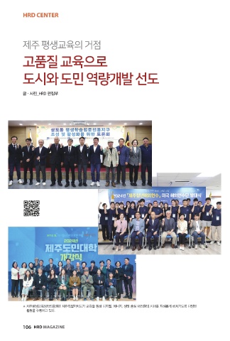 HRD CENTER 제주 평생교육의 거점 고품질 교육으로 도시와 도민 역량개발 선도 글·사진_HRD 편집부 ▲ 제주평생교육장학진흥원은 제주특별자치도가 교육을 통해 디지털, 에너지, 생태 중심 대전환의 시대를 지혜롭게 헤쳐가도록 다양한 활동을 수행하고 있다. 106 HRD MAGAZINE