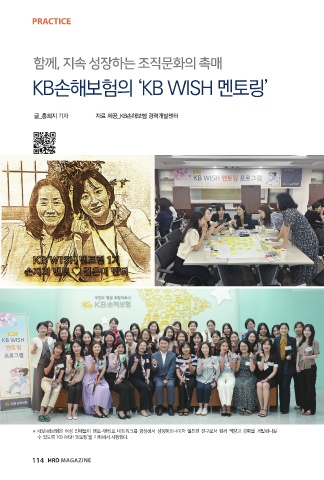 PRACTICE 함께, 지속 성장하는 조직문화의 촉매 KB손해보험의 ‘KB WISH 멘토링’ 글_홍희지 기자 자료 제공_KB손해보험 경력개발센터 ▲ KB손해보험은 여성 인재들이 멘토-멘티로 네트워크를 형성해서 성장파트너이자 절친한 친구로서 함께 역량과 경력을 개발해나갈 수 있도록 ‘KB WISH 멘토링’을 기획해서 시행했다. 114 HRD MAGAZINE