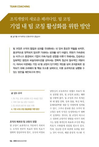다. 따라서 이번에는 기업 내 팀 코칭이 단기적인 개입을 넘어 조직문화로 정